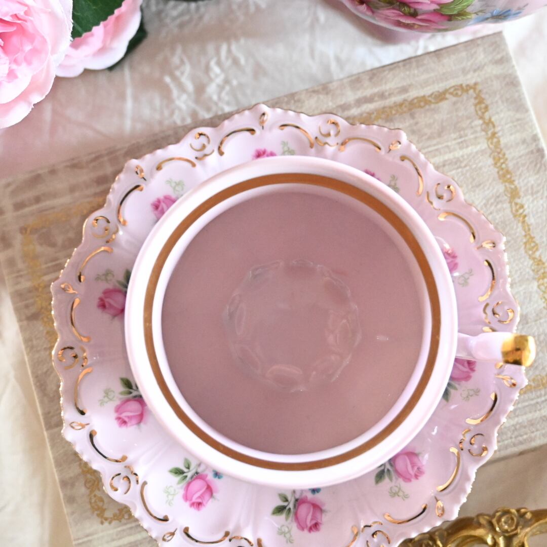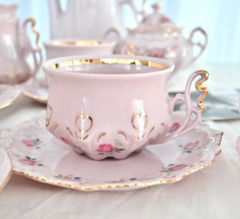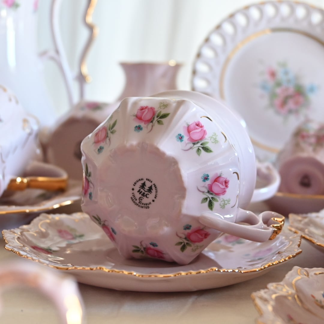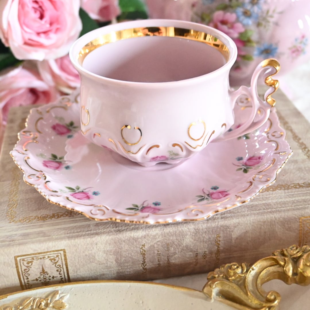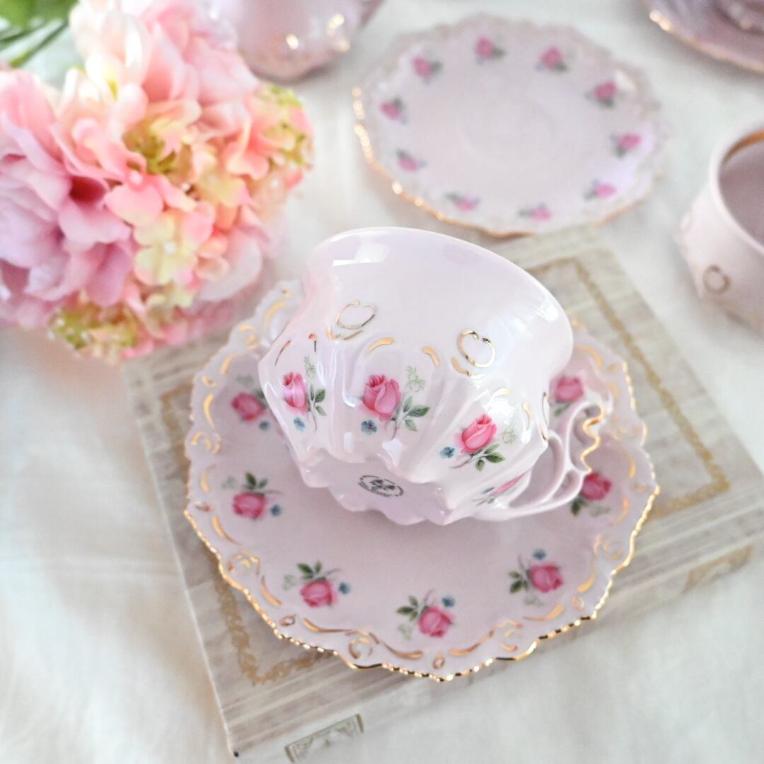 ピンクの可愛い薔薇が描かれたティーカップとソーサーのセット。