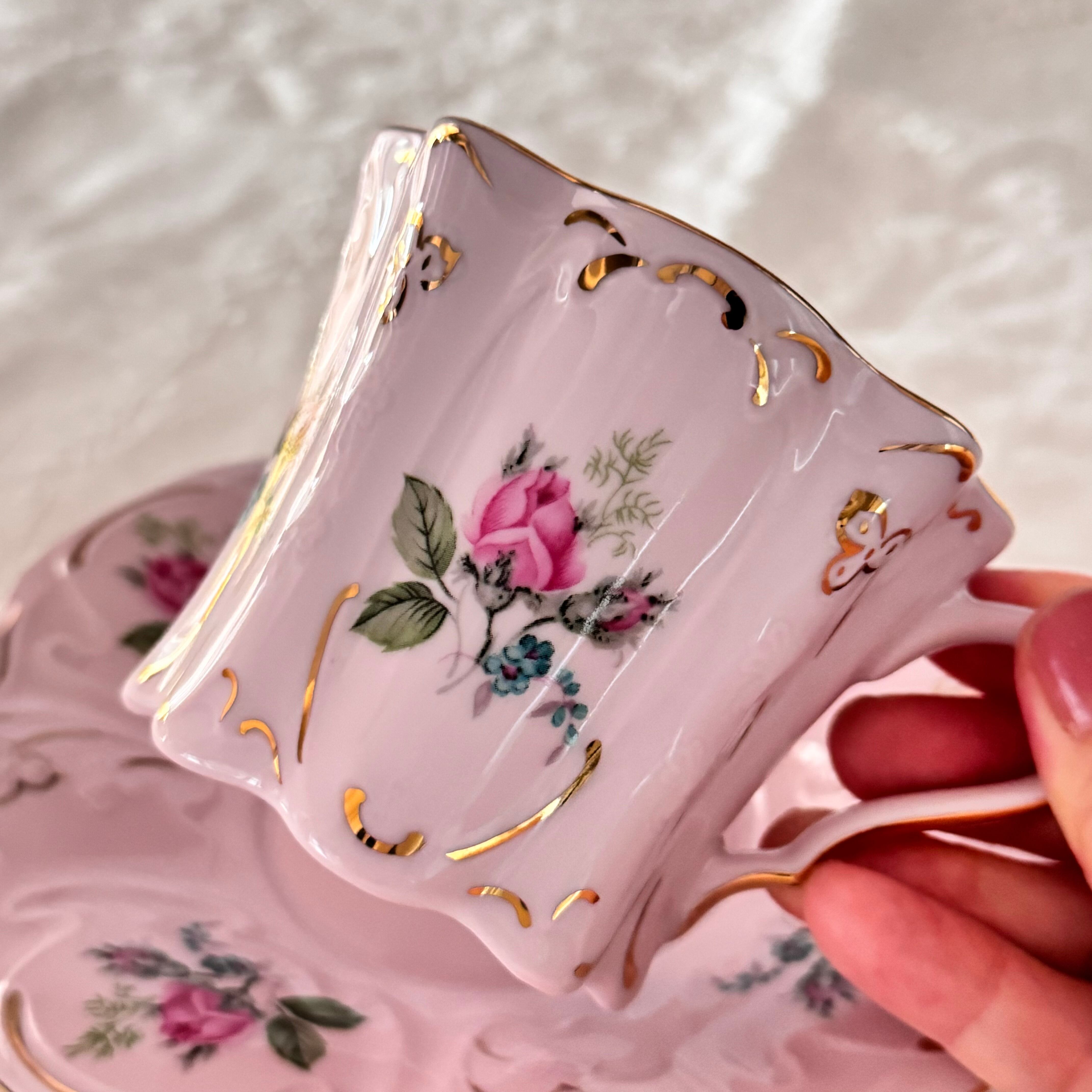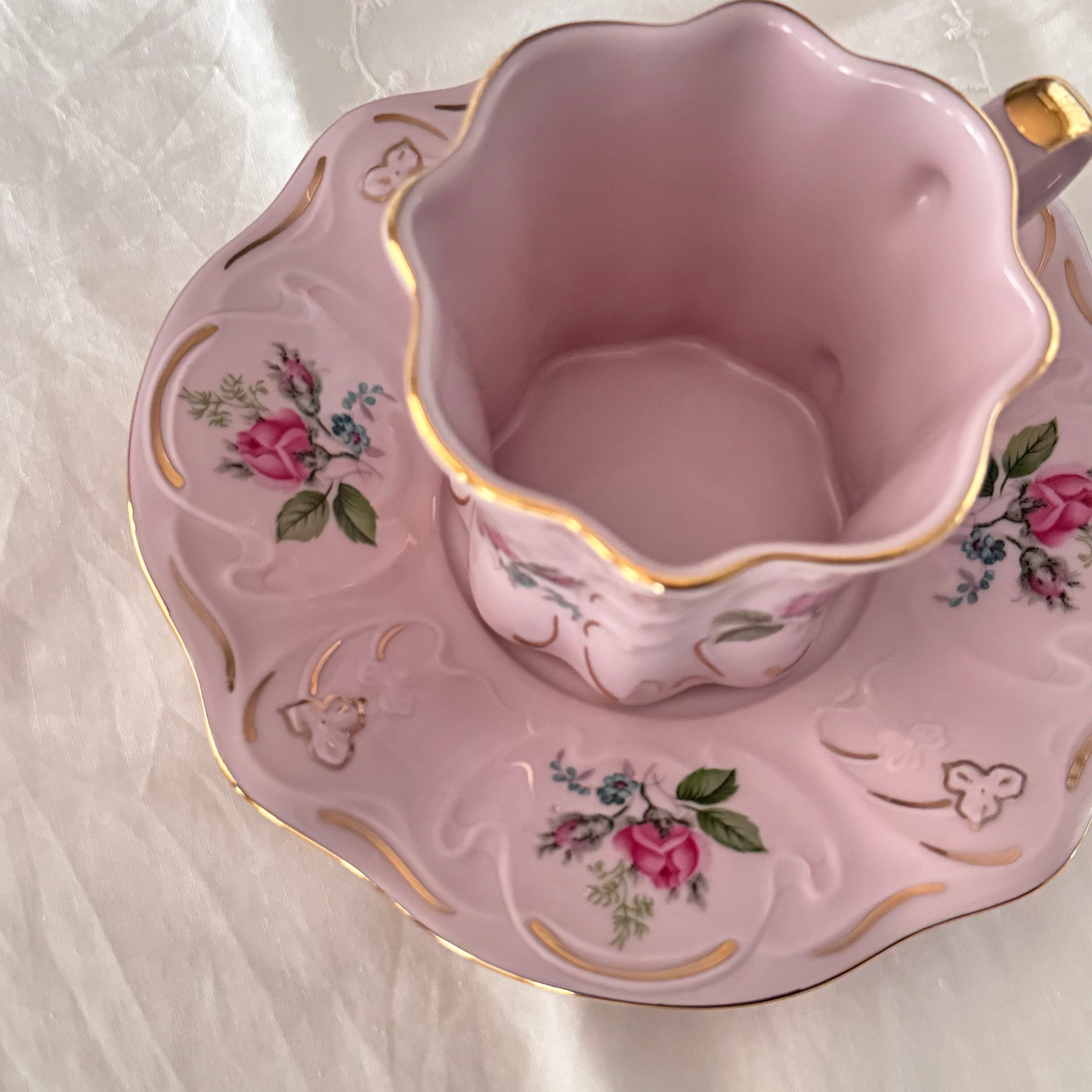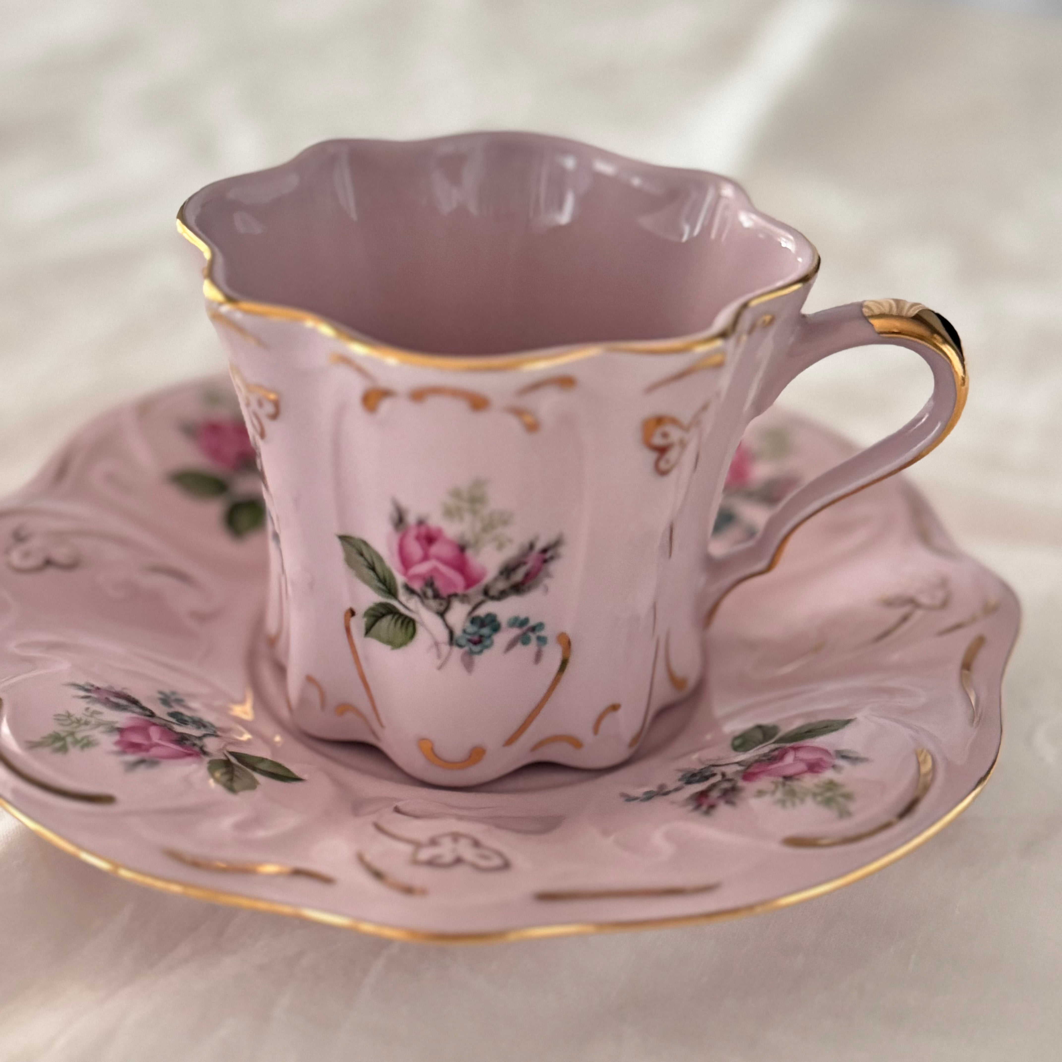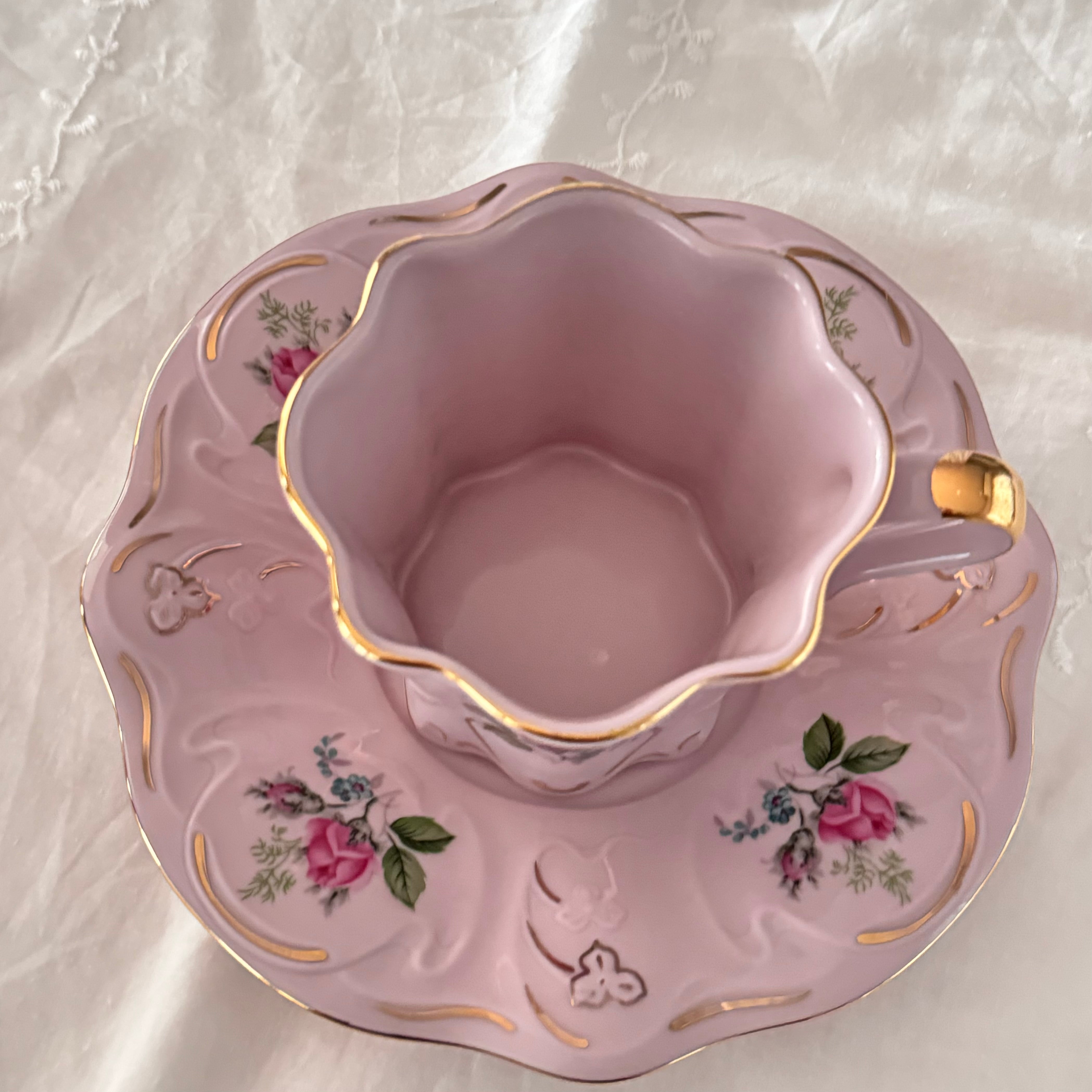 なんとも言えないピンク地にハンドペイントで描かれたピンクの薔薇と金彩がとってもエレガントなコーヒーカップセット。