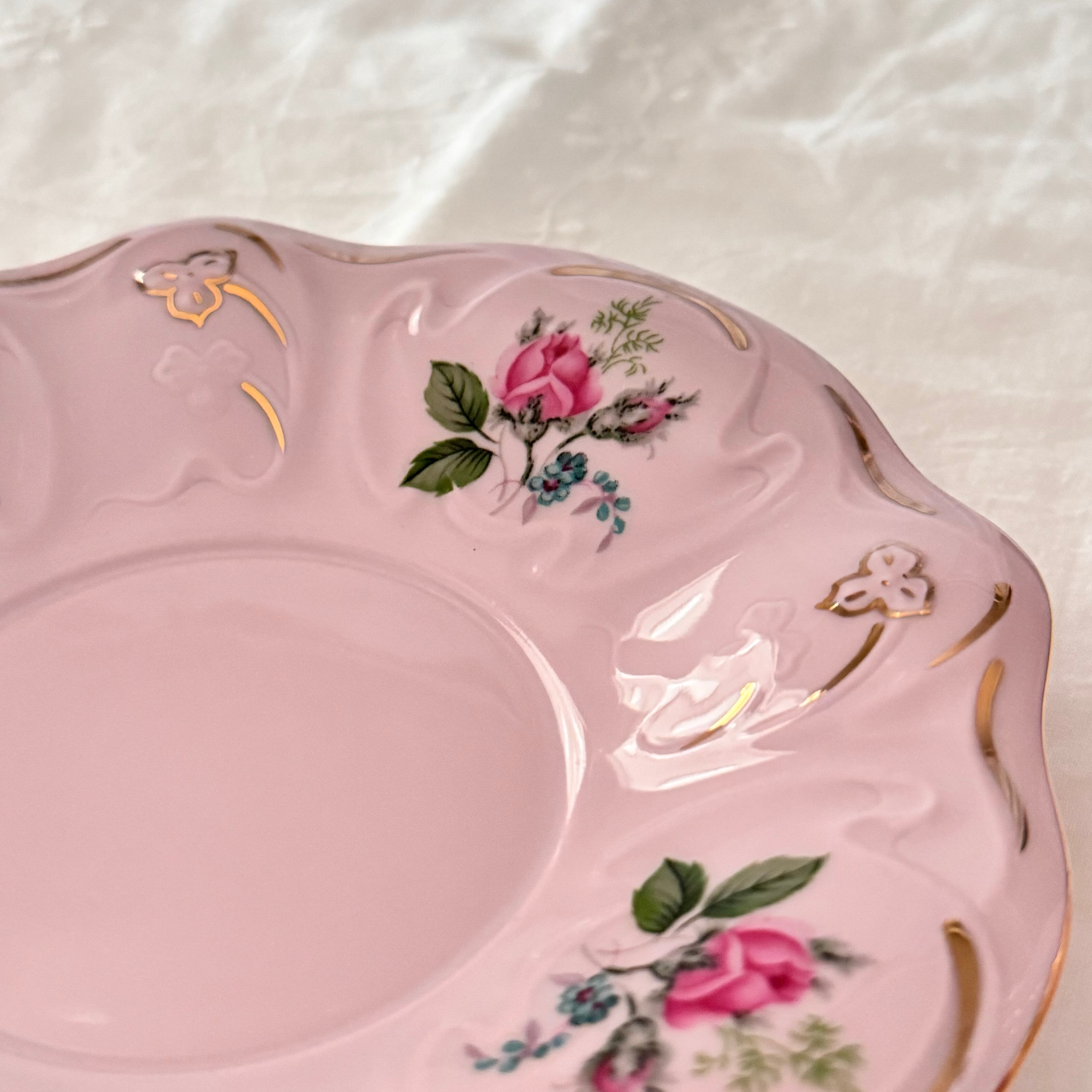 ショドフは1813年創業の高級磁器ブランドで釉薬で色を付ける一般的な製造方法とは違い、土の成分の配合により生地自体がピンクに発色しています。